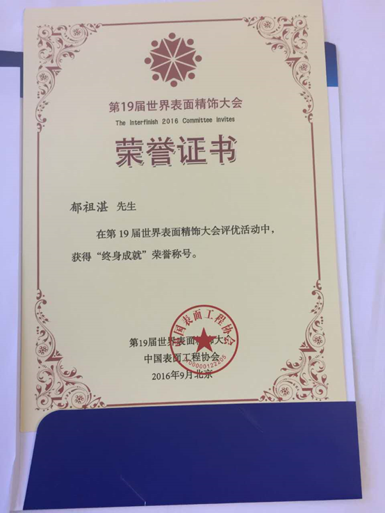 热烈祝贺郁祖湛老师荣获第19届世界表明精饰大会“终身成就”荣誉称号