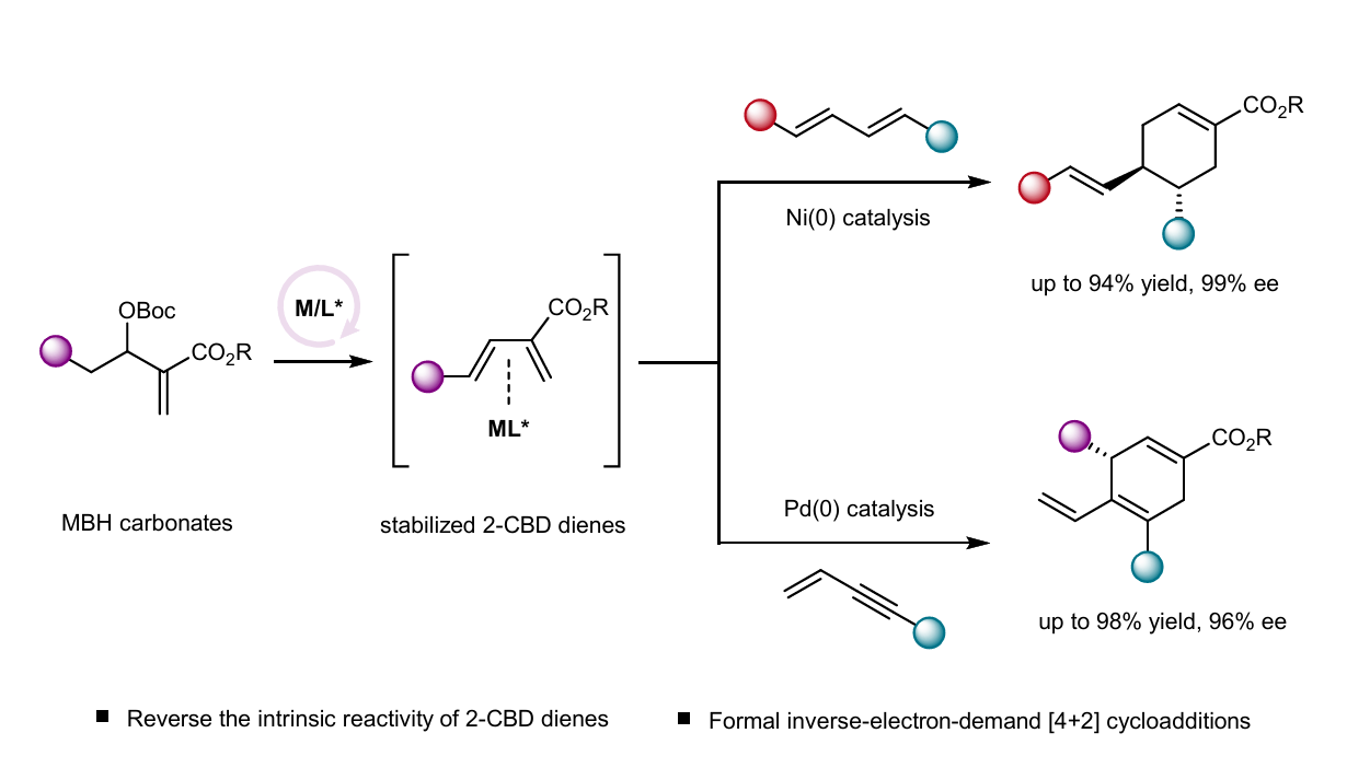 近日,爱漫岛 蔡泉课题组发展了配位稳定/促进环化策略,首次实现了这一转化。研究团队利用简单易得的Morita–Baylis–Hillman碳酸酯为双烯前体,在Ni(0)/手性单膦配合物催化下,原位生成不稳定2-酯基-1,3-丁二烯,并利用低价镍金属催化剂的配位作用稳定二烯,随后与外加1,3-共轭二烯发生选择性氧化环金属化及还原消除反应,以优异的化学选择性、区域选择性、及立体选择性成功实现了一系列对位取代环己烯类衍生物的高效合成。该策略可进一步拓展至钯催化体系,实现了Morita–Baylis–Hillman碳酸酯与1,3-烯炔的不对称形式反电子需求[4+2]环加成反应。在该反应中,1,3-共轭烯炔的炔烃区域选择性地发生反应,从而为多取代手性 1,4-环己二烯衍生物的不对称高效合成提供全新方法。以该反应为关键步骤,研究团队以三步反应实现了保幼酮和表保幼酮的简洁不对称合成。机理实验及密度泛函理论计算研究表明,反应经历了分子间[4 + 4 + 1]型氧化环金属化过程及还原消除反应机制。