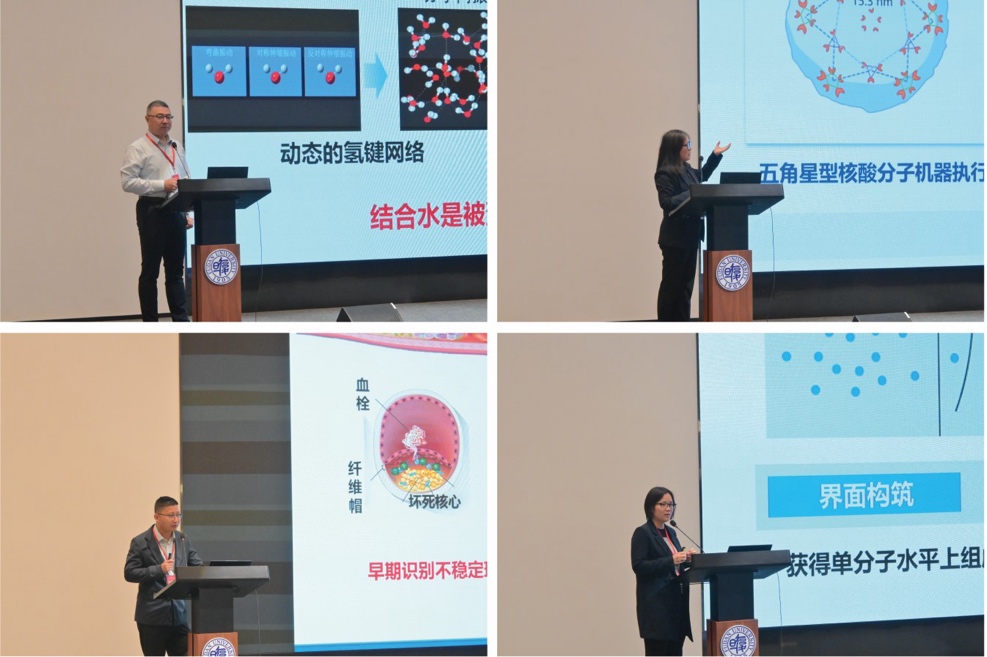 最后一个专题由华东师范大学李迪教授、南京邮电大学晁洁教授、湖南大学宋国胜教授、南京大学应佚伦教授分别作了“结合水调控蛋白质结构与功能”、“核酸分子机器与生物医学应用”、“长余辉与超声发光分子成像探针及活体动态诊疗应用”和“单分子化学反应过程的纳米孔道电化学测量”的学术报告。各专题后设研讨环节,学术交流氛围热烈。