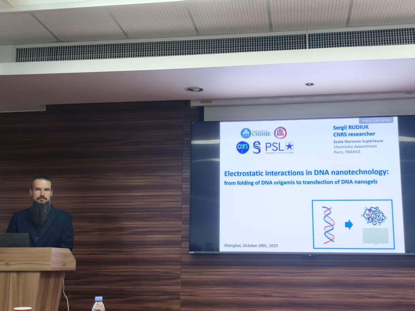 Sergii RUDIUK教授围绕DNA纳米技术中的静电调控展开,他首先探讨电荷环境如何驱动DNA纳米结构从有序折叠到复杂组装的多层次动态过程。在此基础上,其团队研发光敏嵌入剂用于调控DNA纳米结构的杂交,并通过热力学调控DNA折纸的结构变化。此外,Sergii RUDIUK教授将此技术应用于DNA纳米凝胶的设计,并进一步延伸至DNA纳米体系在分子递送与生物响应中的潜在应用。通过融合物理化学机制与生物功能设计,这一研究旨在揭示静电作用在分子尺度上构建与调控生命相关纳米体系的基本原则,为智能可编程生物材料的发展提供新的视角。