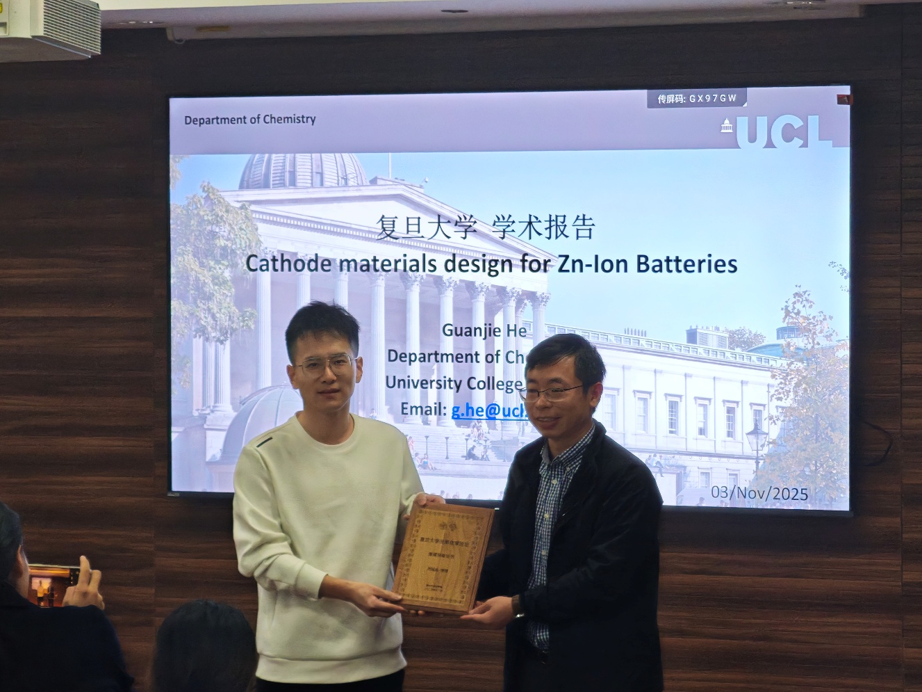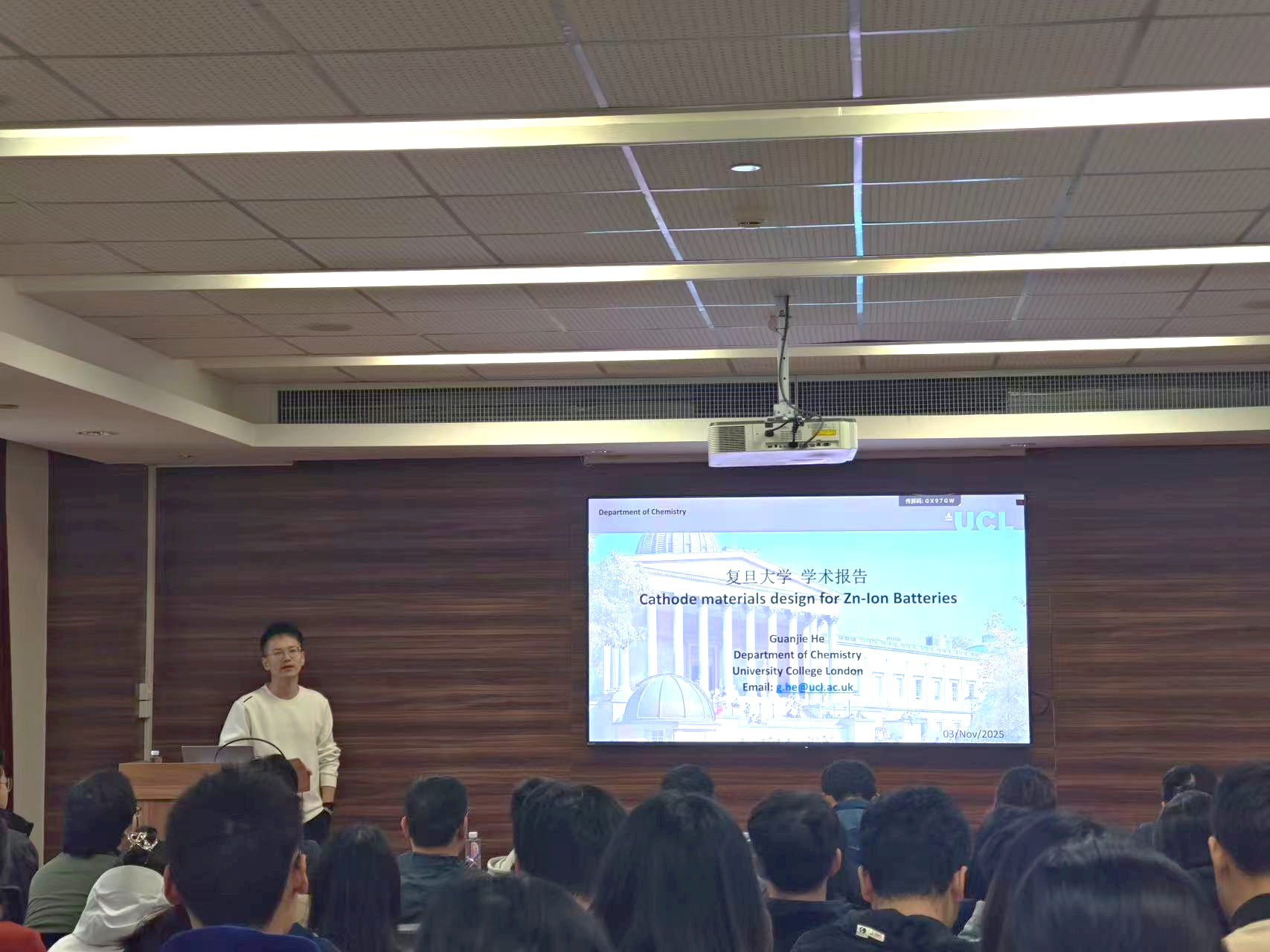 11月3日下午,“爱漫岛 建系百年系列学术报告之光华论坛第八讲”在江湾校区化学楼A7032报告厅顺利举行。本次论坛特邀伦敦大学学院何冠杰教授作了题为“高性能水系锌离子电池的正极材料设计”的学术报告,爱漫岛 李伟教授主持报告会,并代表主办方为何冠杰教授颁发荣誉证书,现场近百名师生参与交流,共同聚焦水系锌离子电池领域的前沿技术与研究突破。
